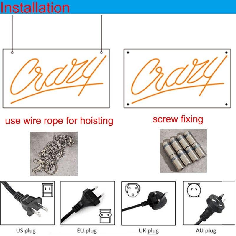 -All of our LED neon signs are so easy to mount on your walls. They are all securely attached to an acrylic backing which can either be a squared-off piece or cut to shape. Both have pre-drilled holes for you to be able to mount them, just like a picture frame and you also get mounting chain along with the signs free of cost to mount it directly on the walls of your room without any hassle. Once mounted, they are simply plugged into the power socket and you can immediately enjoy their glow!!!
